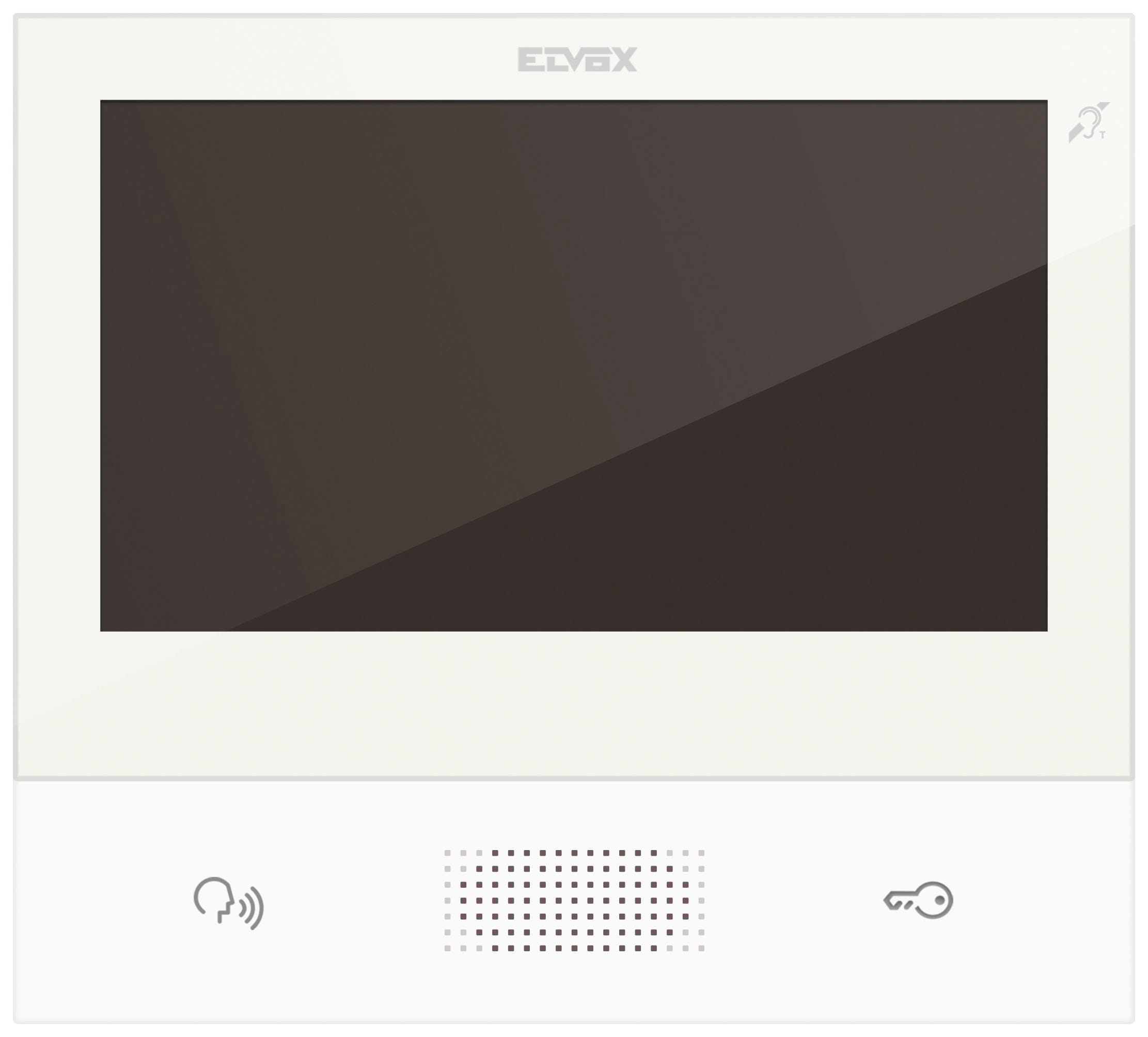 Videocitofono vivavoce da parete per sistema IP, WI-FI integrato per remotizzazione su smartphone con app dedicata, display a colori LCD 7 in touch-screen, tastiera capacitiva per funzioni videocitofoniche e chiamate intercomunicanti, videosegreteria, teleloop per protesi acustiche, staffa per il fissaggio su scatola rettangolare o rotonda, alimentazione PoE, bianco.