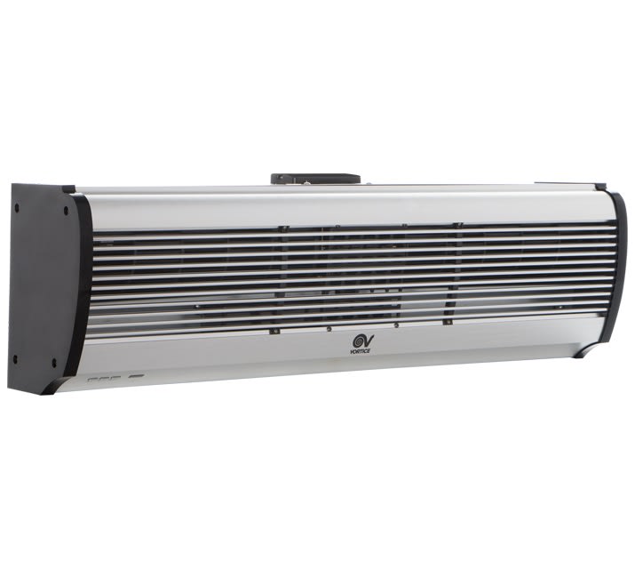 Barriere d’aria per installazione orizzontale fissa in corrispondenza delle porte e, più in generale, delle zone di accesso di locali pubblici, negozi, supermercati o centri commerciali, generano una lama d’aria che ostacola l’ingresso di aria esterna a temperatura diversa da quella desiderata. Particolarmente indicate anche per prevenire l’ingresso di fumo, smog o insetti ed evitare la diffusione di odori tra ambienti contigui. Involucri caratterizzati da pannelli frontali in alluminio spazzolato di colore grigio argento integranti la griglia di aspirazione; pannelli posteriori in lamiera d’acciaio verniciata nera; fianchetti in resina plastica nera. Ventilatori tangenziali, a garanzia di bassi livelli di emissioni sonore, azionati da motori asincroni bialbero a due velocità per il miglior compromesso tra prestazione erogata, temperatura del flusso d’aria generato (nel caso dei modelli con batteria elettrica), e livello di emissione sonora. 2 velocità di funzionamento. I modelli AIR DOOR H hanno batterie elettriche a termoresistori (PTC) caratterizzate da elevate rese termiche e ridotta resistenza aerodinamica, protette contro sovratemperature e picchi di tensione. La specifica logica di funzionamento, che ritarda di 30” l’arresto del ventilatore dopo lo spegnimento della resistenza, contribuisce al loro affidabile funzionamento nel tempo. Alette orientabili, montate in corrispondenza della zona di fuoriuscita dell’aria, permettono di orientare il flusso generato. Consentono risparmio nei consumi perchéevitano la creazione di variazioni termiche e di dispersioni: anche i climatizzatori (in estate) o i riscaldamenti (in inverno) lavorano in modo più efficace, risparmiando a loro volta il proprio consumo. Sono utilizzabili in tutte le stagioni: sono modelli in versione neutra. Grande flessibilità di installazione: la posizione frontale della griglia di aspirazione consente il montaggio anche a ridosso del soffitto nei locali di altezza ridotta (minimo 2.55 m). Facilità e rapidità di installazione, graziealla pratica staffa in dotazione. Possibilità di installazione in serie, per coprire aperture di elevata larghezza. Abbinabili a sensori porta standard presenti sul mercato. Classe di Isolamento: Cl.I .