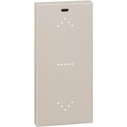 Comando FULL - comando capacitivo per gestire da una a tre funzioni tra le seguenti: on/off luci, dimmer luci, su/giu tapparella con e senza preset, controllo carichi e scenari. Può essere utilizzato anche come comando di gruppo e generale. È dotato di un sensore di prossimità che permette di mostrare icone identificative delle funzioni quando ci si avvicina al comando - 1 modulo - colore sabbia.